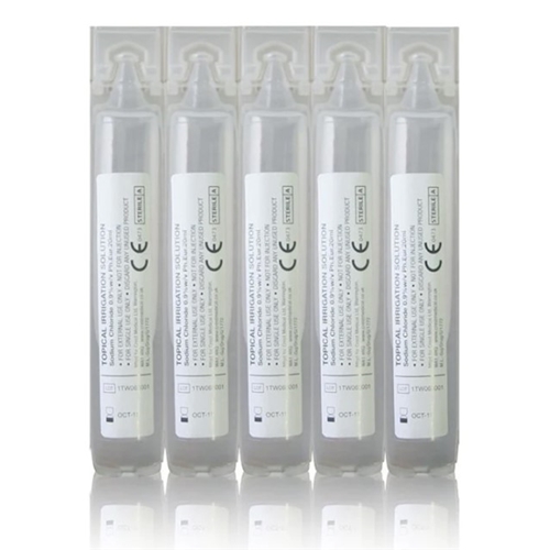 - 0.9% sterile saline solution is ideal for irrigating eyes