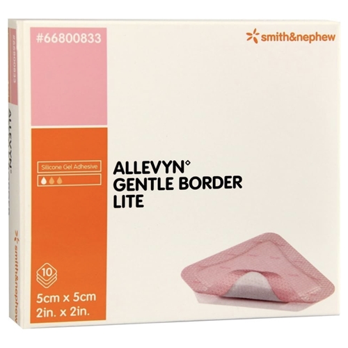 Introducing ALLEVYN Gentle Border Lite Silicone Gel Adhesive Hydrocellular Dressings, a cutting-edge solution for advanced wound care. This pack includes 10 dressings, each measuring 5cm x 5cm, designed to provide optimal healing conditions for various types of wounds.