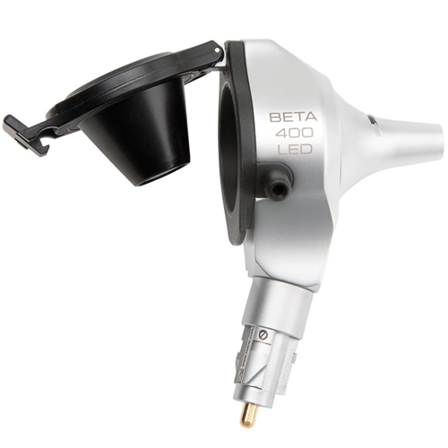 HEINE BETA 400® F.O. LED Otoscope head can be used with HEINE AllSpec® disposable ear tips, reusable tips as well as insufflation bulb.