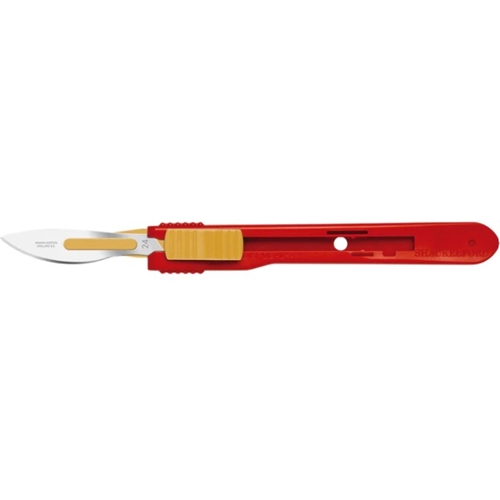 Supporting existing safe passing protocols and procedures the scalpel has a reinforced temporary lock in the forward user position ensuring the blade will stay extended even if it encounters a hard surface or bone during use. When in the retracted position the slider mechanism contains a notch that holds the blade securely in the retracted position. A permanent lock position at the rear of the scalpel, requiring a conscious amount of force to engage the slider, ensures the contaminated blade remains retracted whilst disposing in an appropriate sharps container at the end of the procedure.