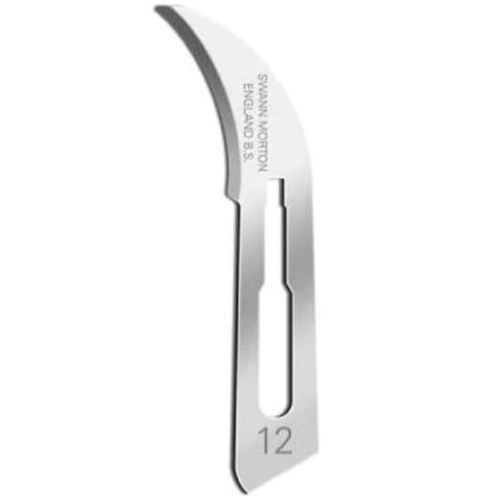 The No.12 is a small, pointed, crescent shaped blade sharpened along the inside edge of the curve. It is sometimes utilised as a suture cutter but also for arteriotomies ( surgical incision of an artery), parotid surgeries (facial salivary glands), mucosal cuts on a septoplasty (repair of nasal septum) and during cleft palate procedures, ureterolithotomies (calculus removal by incision of the ureter) and pyelolithotomies (surgical incision of the renal pelvis of a kidney for the removal of a kidney stone - also known as a pelviolithotomy ). The No.12 fits Handles 3, 3L, 3 Graduated, 5B, 7, 9, B3 and B3L.