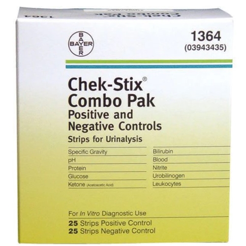 When used with Siemens reagents strips, Chek-Stix provide defined results for glucose, bilirubin, ketone, specific gravity, blood, pH, protein, urobilinogen, nitrite and leukocytes. Each Chek-Stix positive strip is made from firm plastic with seven sperate analyte areas. These areas contain one or more natural or synthetic ingredients which produce a positive control solution when dissolved in a measure quanity of distilled or deionised water. The negative control contains siz analyte areas which produce a negative control solution.