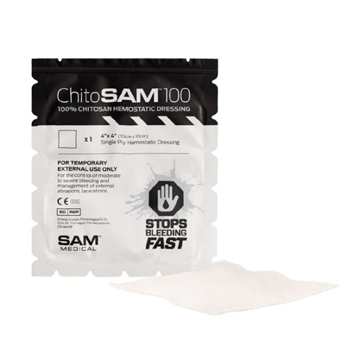 The ChitoSAM™ 100 is a high-performance haemostatic, non-woven chitosan dressing spun directly from chitosan (derived crustaceans). The single ply dressing is 10x10cm (4x4in) and is ideal to be placed on small wounds in addition to trauma gauzes.