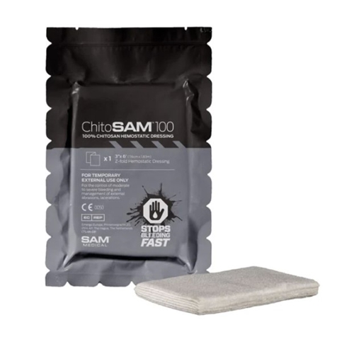 The ChitoSAM™ 100 is a high-performance haemostatic, non-woven chitosan dressing spun directly from chitosan (derived crustaceans). The z-fold dressing is 3in x4ft (7.6cm x 1.22m) and is ideal to be placed on larger wounds in addition to trauma gauzes.