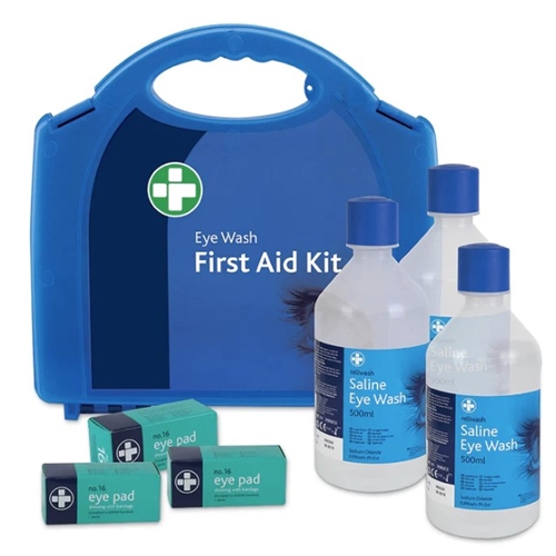 The triple eye wash station is in a stylish Integral Aura box in durable polypropylene, blue safety clips, bracket and integrated handle, may be wall mounted. Provides fast and effective treatment in the workplace or home, meeting the guidelines given by the Health & Safety Executive.