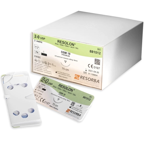 RESOLON is a monofilament Polyamid 6 thread. This suture material was developed especially for RESORBA. RESOLON undergoes special treatment during the manufacturing process. This accounts for RESOLON's above average softness and flexibility, even in a dry, sterile condition. This results in good handling and knotting qualities with simultaneous optimum knot tensile strength. While the indications for RESOLON are limited due to its hydrophilic nature, RESOLON is particularly well-suited for skin sutures.