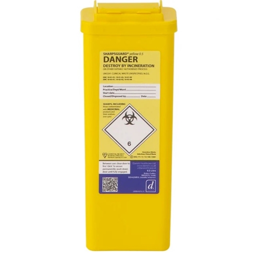 Ideal for community healthcare workers and easily fitted into a bag or glove compartment, the SHARPSGUARD ® yellow 0.5 has a needle remover.Supplied with lid assembled. The container is manufactured to BS7320:1990.