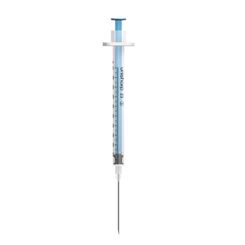 Unisharp 1mL 23G 32mm (1 1/4 inch) fixed needle syringe.