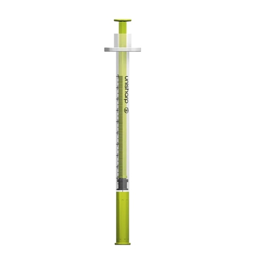 High quality, 1mL fixed needle low dead space syringe with volume markings in mL rather than insulin units.