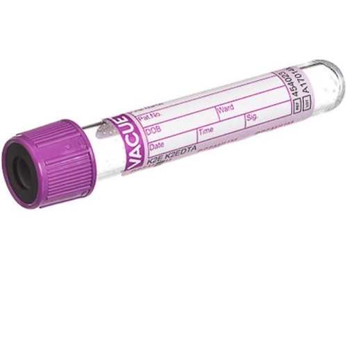 The VACUETTE® PREMIUM Tube K2EDTA 4 mL is a sterile blood collection tube designed for accurate and reliable hematology testing. It contains K2EDTA (dipotassium EDTA) as an anticoagulant to prevent clotting and preserve cellular components. The tube has a 4 mL draw volume, measures 13 x 75 mm, and features a purple cap with a black ring for easy identification.