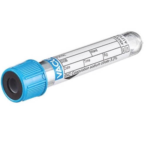The VACUETTE® NaC 3.2% Tube, 3ml, Sandwich format with a blue/black cap is a sterile blood collection tube containing 3.2% sodium citrate as an anticoagulant. Designed primarily for coagulation testing, it ensures accurate plasma yield by preventing clotting during sample processing. Supplied in a pack of 50 tubes, ideal for use in hematology and coagulation laboratories.